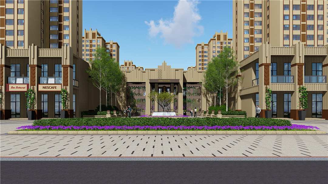 項目建筑為ARTDECO風格,外立面公調明快,偏暖色調為主,輪廊線豐富,層次感強。建筑形式以高層住宅+沿街商業。