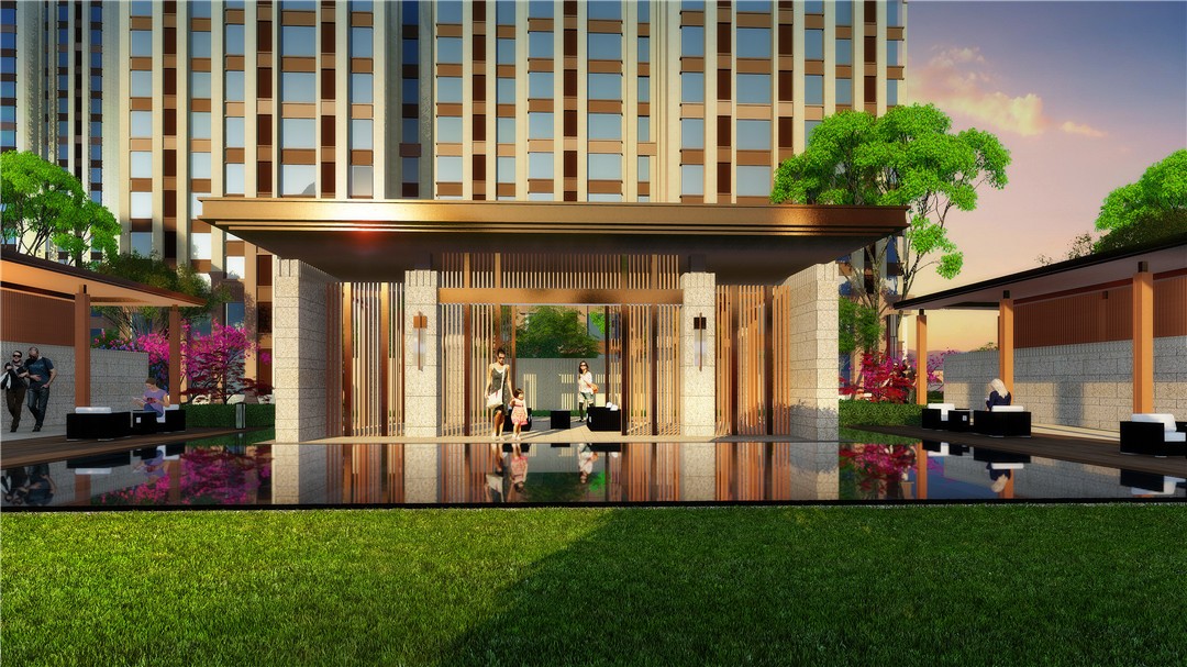 商業及綜合辦公樓為現代風格,材質為米色石材灰色鋁板結合玻璃幕墻,住宅為ARTDECO風格,材質以米灰色涂料和深棕色石材為主,景觀在材質上與建筑相呼應。