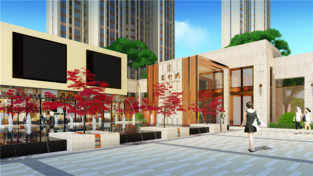 其一入口空間,通過山、林、竹、石、譚、瀑元素運用打造富有人文底韻的商業景觀